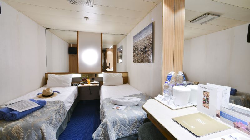 Les cabines extérieures mesurent de 11 à 16 m2. Le décor élégant s’ouvre soit sur un hublot, soit sur un sabord. Tous les équipements nécessaires sont présents : salle d’eau avec douche, sèche-cheveux, téléphone, coffre-fort, mini-bar et télévision. Ces cabines peuvent accueillir jusqu’à 4 personnes.