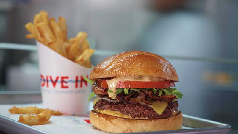 Le Dive-In est le reflet de la cuisine américaine telle qu'elle existe aux États-Unis. Vous pourrez apprécier un superbe hamburger accompagné d'une sauce dont la recette secrète est concoctée par les cuisiniers de la compagnie, un hot-dog avec de délicieuses frites ou tout simplement des sandwichs comme savent les faire les américains.