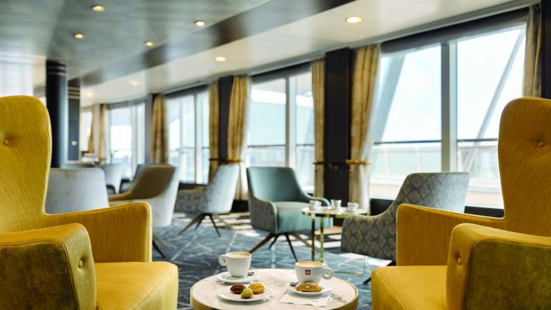 Avec ses larges baies vitrées, le salon Horizons est le salon d’observation à bord, pour profiter des paysages tout en sirotant un verre dans un cadre élégant et une ambiance décontractée.
