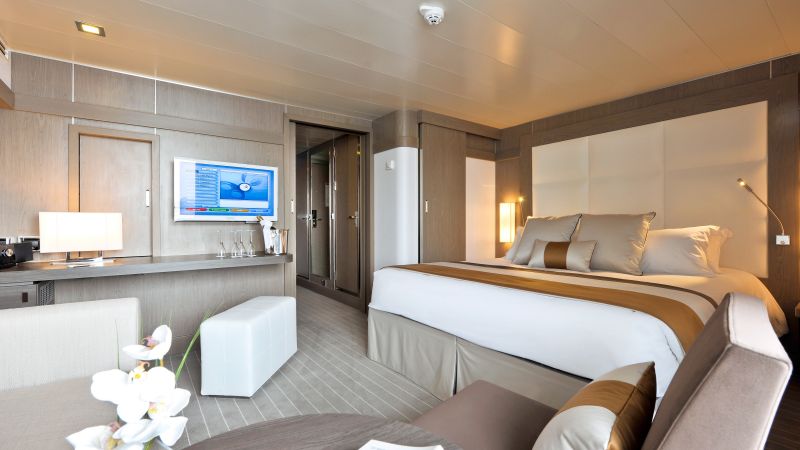 Toutes les suites et cabines sont dotées d’une vue sur l’océan. Elles sont en outre équipées d’une climatisation individuelle, d’un mini bar, d’un téléviseur à écran plat avec chaînes par satellite, d’une enceinte Bluetooth BoseTM, d’un espace bureau avec papier à lettre, d’un coffre-fort électronique, de produits de bain HermèsR, d’une coiffeuse avec sèche-cheveux, d’un téléphone satellitaire et d’un accès illimité et gratuit au Wi-Fi du bord.