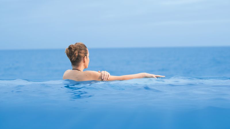 Située à proximité du spa, la piscine à débordement offre une vue exceptionnelle sur l’océan et l’horizon. Terrasse en teck, serviettes moelleuses, c’est un endroit de détente et calme absolu.
