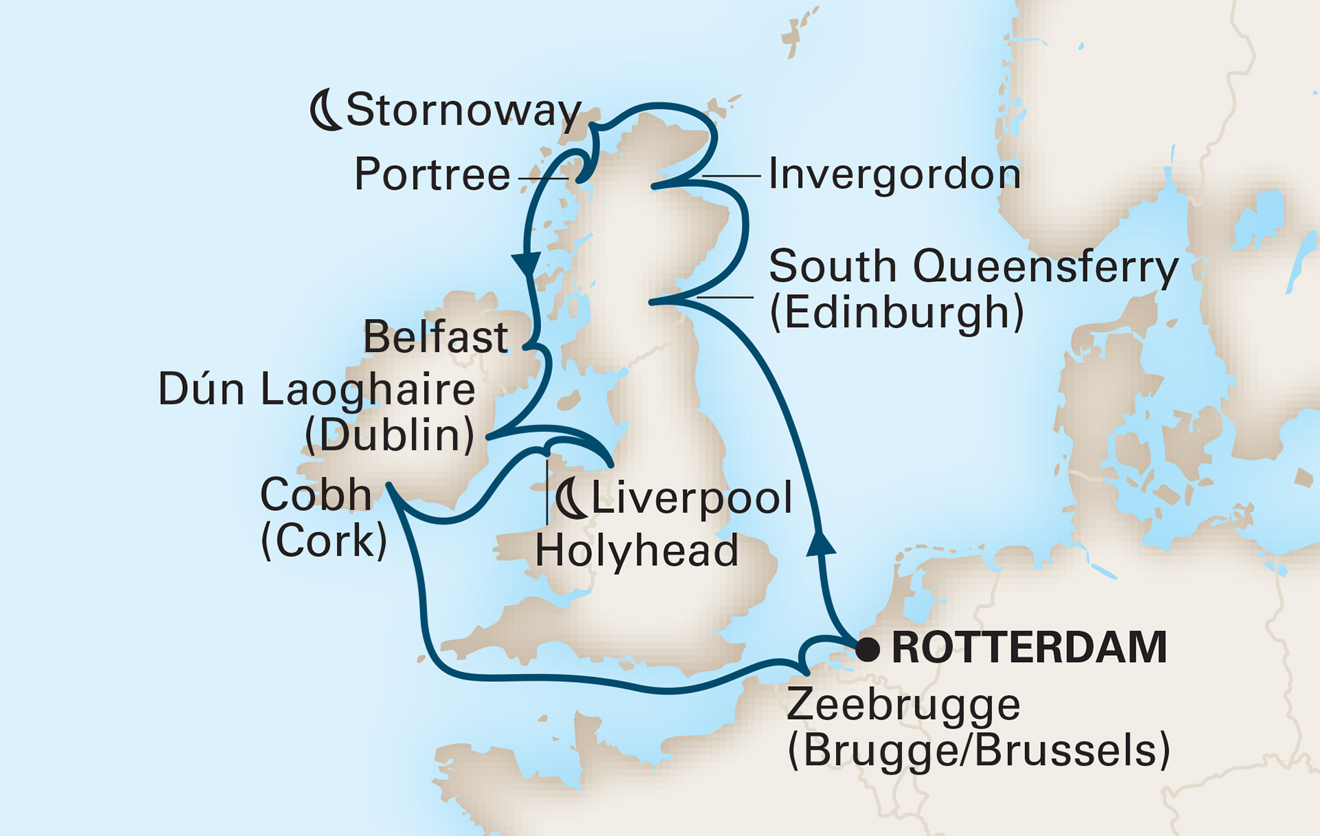 Admirez la rêveuse île de Lewis et l'île de Skye en Écosse, ainsi que des villes dynamiques et de charmantes stations balnéaires en Irlande, au Royaume-Uni, au Pays de Galles et en Belgique lors de cet aller-retour à Rotterdam.