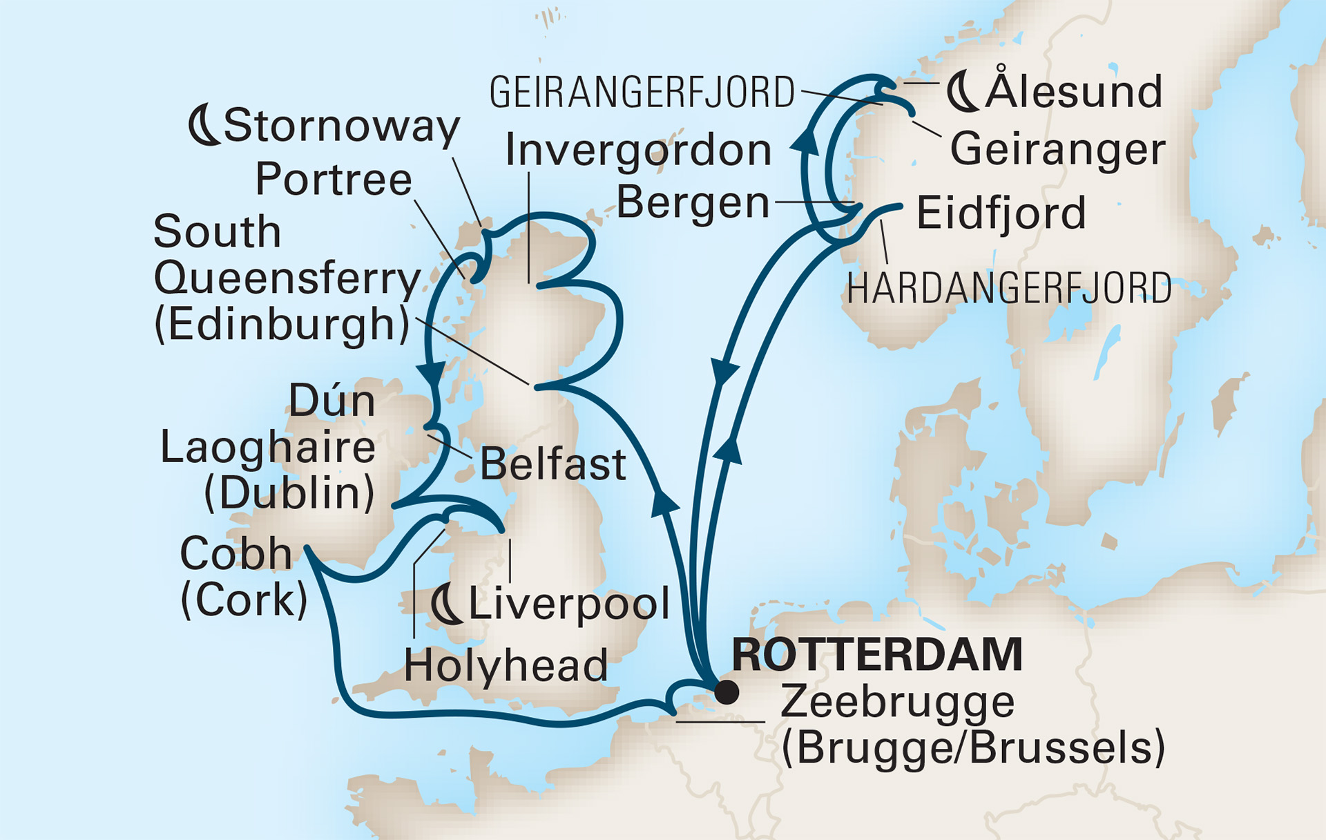 Une croisière inoubliable au départ de Rotterdam qui visite les îles de rêve de l'Écosse, les fjords envoûtants de la Norvège, les villes emblématiques du Royaume-Uni pendant 21 jours magiques.