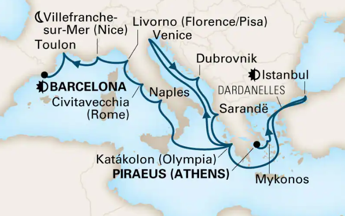 La Mer Égée et Méditerranée, d'Athènes (Le Pirée) à Barcelone