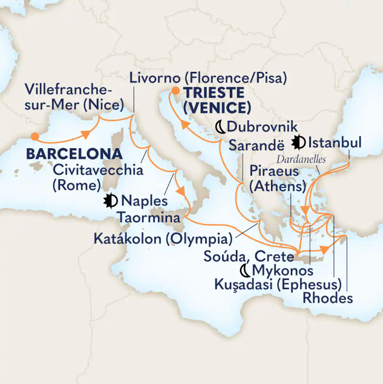 Toutes les escales et les amplitudes horaires indiquées sont données à titre indicatif et sont susceptibles d’être modifiées par les compagnies maritimes à tout moment, avant le départ ou pendant la croisière.