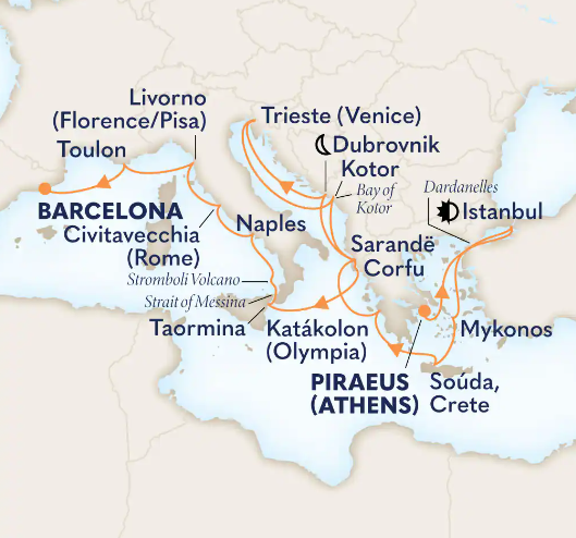 Toutes les escales et les amplitudes horaires indiquées sont données à titre indicatif et sont susceptibles d’être modifiées par les compagnies maritimes à tout moment, avant le départ ou pendant la croisière.