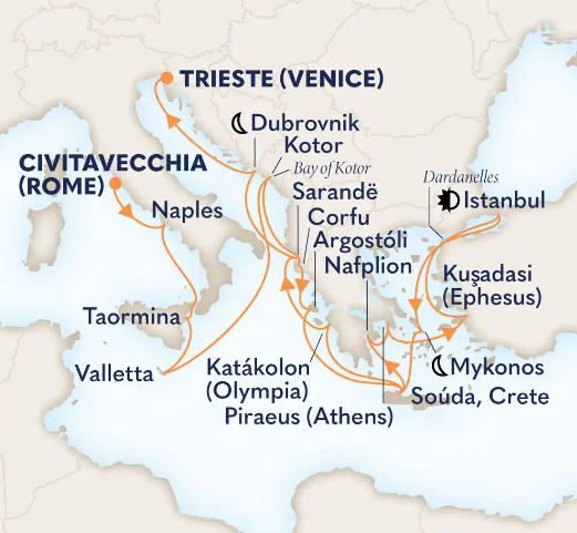 Toutes les escales et les amplitudes horaires indiquées sont données à titre indicatif et sont susceptibles d’être modifiées par les compagnies maritimes à tout moment, avant le départ ou pendant la croisière.