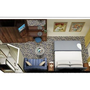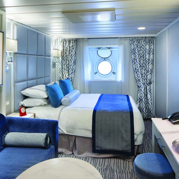 Un hublot classique laisse entrer la lumière et éclaire le décor remarquablement rénové de ces cabines pratiques de 15 mètres carrés, conçues avec goût pour maximiser l’espace. Profitez d’un coin salon confortable avec un canapé pour vous détendre, ainsi que d’une coiffeuse, d’une table de petit-déjeuner et d’un mini-bar/réfrigérateur.