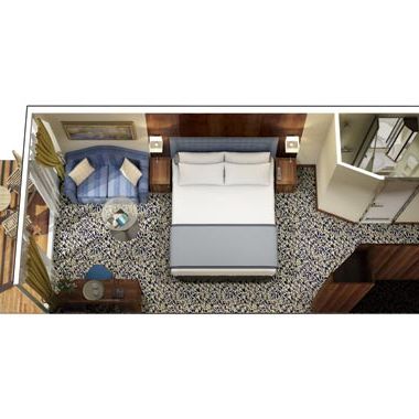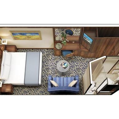 Avec les rideaux ouverts et la lumière naturelle entrant en abondance, ces accueillantes cabines de 15 mètres carrés semblent encore plus spacieuses. Le vaste coin salon, la coiffeuse, le mini-bar/réfrigérateur et la table de petit-déjeuner sont mis en valeur par un décor chaleureux dans des coloris riches et des tissus élégants.