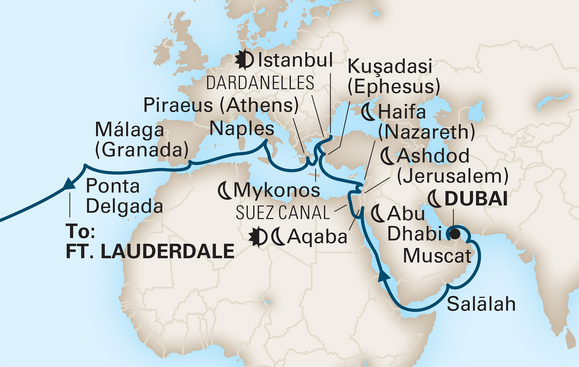Une beauté ineffable vous attend lors de cette croisière de Dubaï jusqu'à Ft. Lauderdale. Arrêtez-vous dans les villes côtières du Moyen-Orient et d'Europe, transitez par le canal de Suez, explorez la Jordanie et la Turquie pendant la nuit.