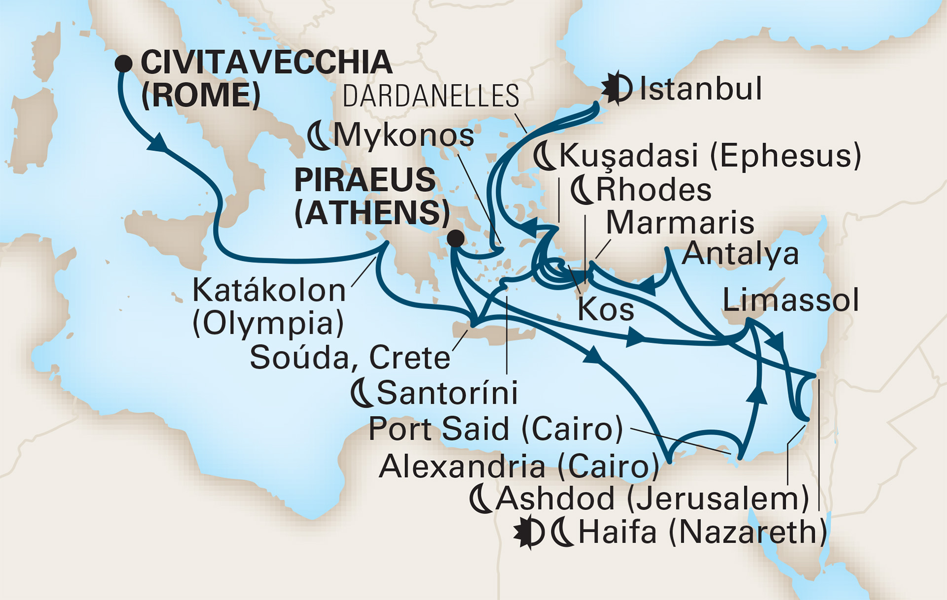 Toutes les escales et les amplitudes horaires indiquées sont données à titre indicatif et sont susceptibles d’être modifiées par les compagnies maritimes à tout moment, avant le départ ou pendant la croisière.