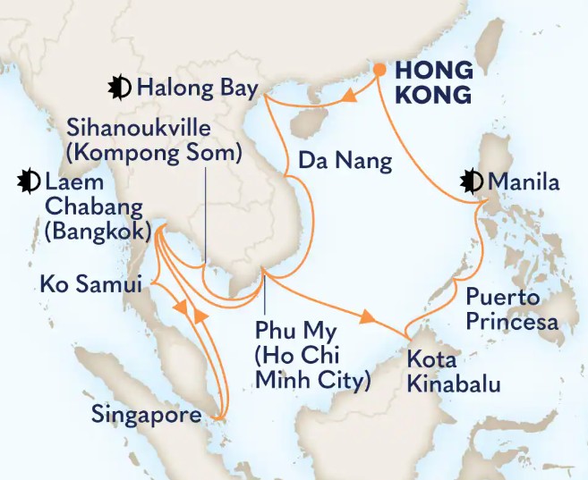 Toutes les escales et les amplitudes horaires indiquées sont données à titre indicatif et sont susceptibles d’être modifiées par les compagnies maritimes à tout moment, avant le départ ou pendant la croisière.