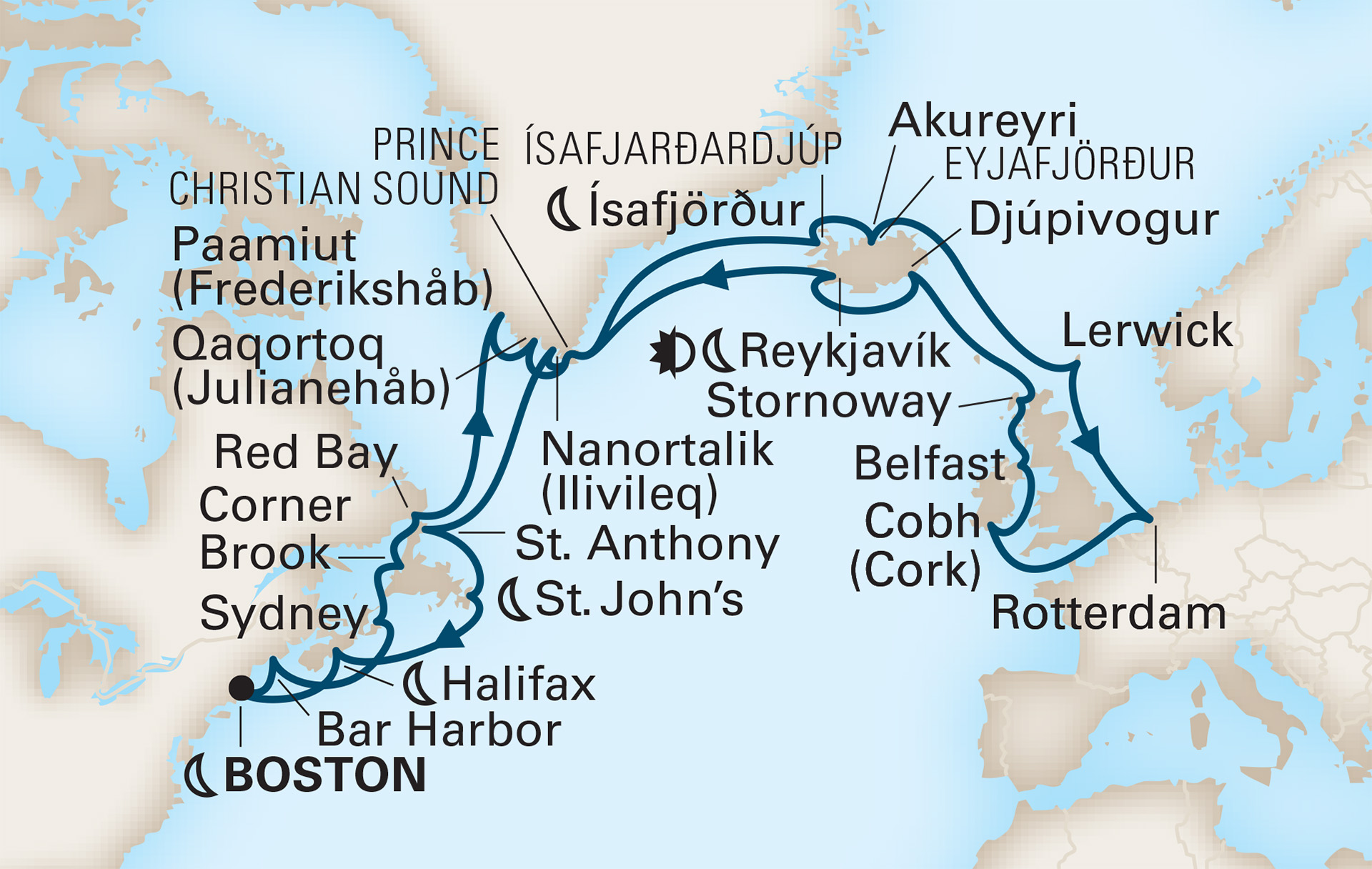 Un aller-retour épique de Boston aux côtes escarpées du Canada et de l'Europe. Naviguez dans la nature sauvage du Groenland, les fjords cristallins d'Islande, les célèbres bourgs d'Irlande. Passez la nuit à Reykjavik.