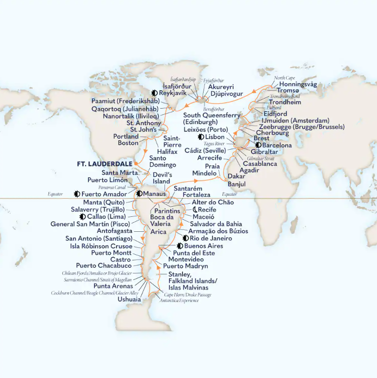 Toutes les escales et les amplitudes horaires indiquées sont données à titre indicatif et sont susceptibles d’être modifiées par les compagnies maritimes à tout moment, avant le départ ou pendant la croisière.