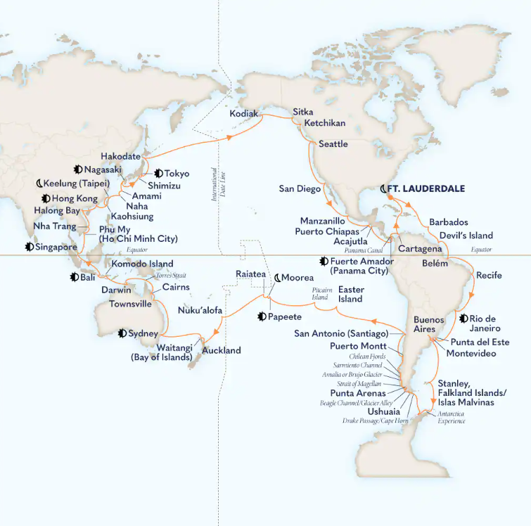 Toutes les escales et les amplitudes horaires indiquées sont données à titre indicatif et sont susceptibles d’être modifiées par les compagnies maritimes à tout moment, avant le départ ou pendant la croisière.