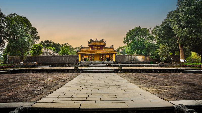 La citadelle de Hué fut construite en 1805, sous le règne de l’empereur Gia Long, selon un plan inspiré des fortifications de Vauban. La citadelle, qui a conservé l’éclat du pourpre et de l’or qui l’habillèrent au temps de sa splendeur, s’organise en espaces concentriques, renfermant la Cité impériale et la Cité pourpre interdite. Protégée par un canal et une enceinte en briques longue de 10 km, elle couvre une superficie de 520 hectares.