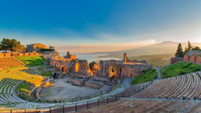 Lieu de villégiature depuis l'époque des Grecs et des Romains, très apprécié des Anglais et des Allemands, Taormine est aujourd'hui probablement l'endroit le plus fréquenté de Sicile. Suspendue à flanc de montagne au-dessus de la mer, elle a réussi à préserver son caractère médiéval et offre un large éventail de richesses architecturales, dont la plus fameuse est incontestablement son merveilleux théâtre grec qui offre des vues magnifiques sur l'Etna et sur la mer.