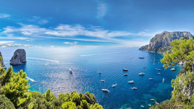 Des maisons éclatantes de blancheur, des placettes théâtrales, des ruelles parfois couvertes, une apparence très mauresque : telle se présente la capitale de l'île au flot de ses visiteurs qui déambulent le long des boutiques ou envahissent les terrasses dans l'attente du départ du bateau... Mais dès que l'on s'éloigne du centre, sur de longs chemins bordés de villas et de jardins luxuriants, loin de la foule, la magie de Capri opère peu à peu. A voir : Monte Solaro, la Grotta Azzurra, la Villa Jovis, la Villa San Michele et la Piazzetta (Piazza Umberto I).