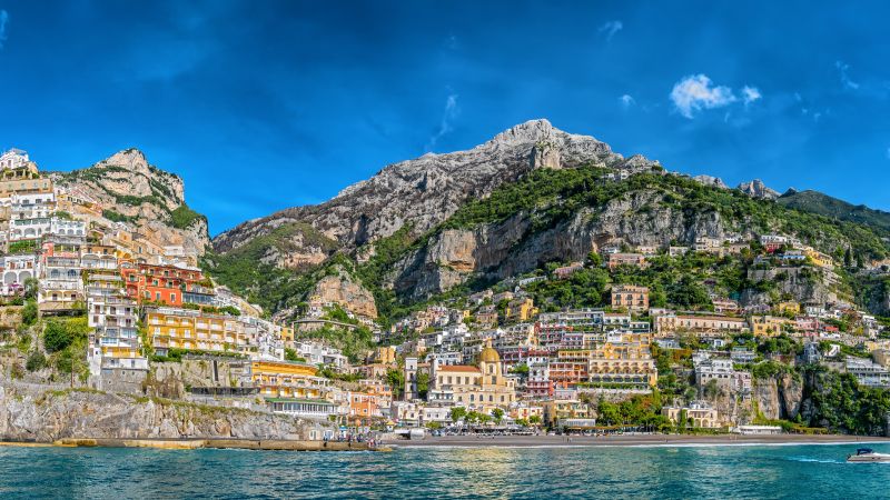 Posée sur une falaise verticale plongeant dans les eaux turquoise, Positano est une ravissante cité aux maisons de pêcheurs d'un blanc éclatant entassées autour du dôme de tuiles vernissées de sa collégiale. Rien d'étonnant si artistes et intellectuels en ont fait naguère un de leurs lieux de villégiature favoris ! Par une chance inouïe, la topographie difficile du lieu en a écarté les promoteurs immobiliers, si bien que la petite cité balnéaire a conservé son aspect paradisiaque.